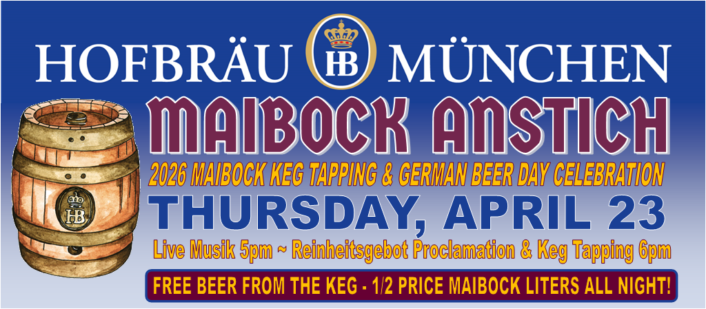 The beer served is brewed in Munich according to the “Reinheitsgebot” or Purity Act of 1516. Our kitchen serves up traditional Bavarian festival food and specialties, including giant pretzels imported from Munich. Come experience Gemütlichkeit, at a magical place where people enter as strangers and leave as friends. Prost!